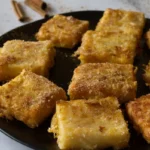 - Corta la mezcla en cuadrados de aproximadamente 5×5 cm. Pasa cada cuadrado por huevo batido y fríe en aceite caliente hasta que estén dorados por ambos lados. Retira del aceite y coloca sobre papel absorbente para eliminar el exceso de grasa.